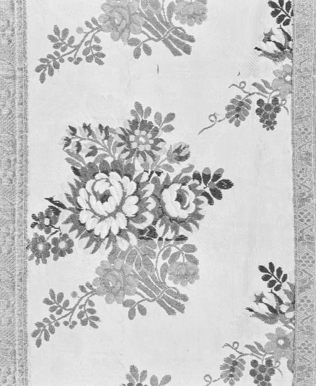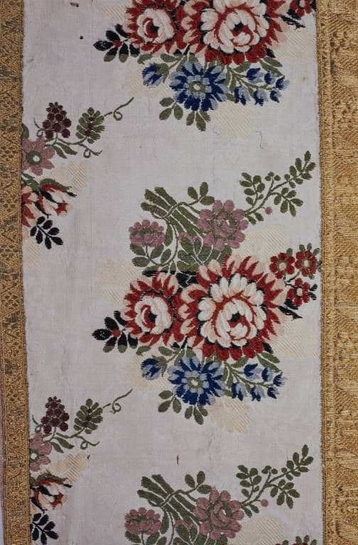 soie (blanc) : taffetas, liseré, broché, polychrome ; coton (jaune), fil métal : satin, lancé, latté, polychrome