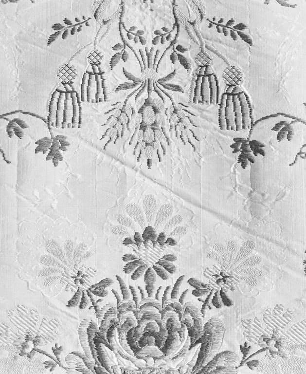 soie (polychrome) : satin, liseré (?), latté ; taffetas (blanc) : liseré, broché, polychrome