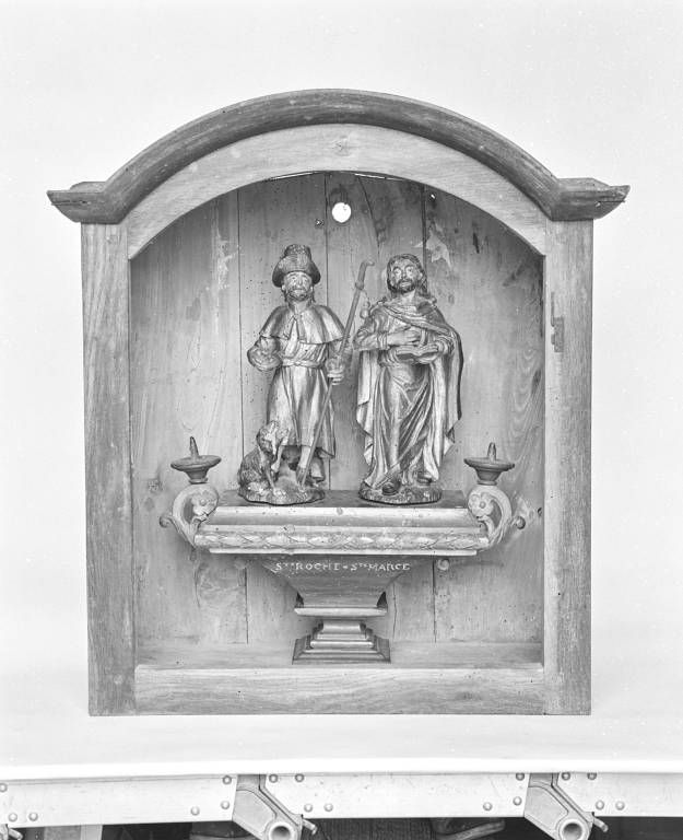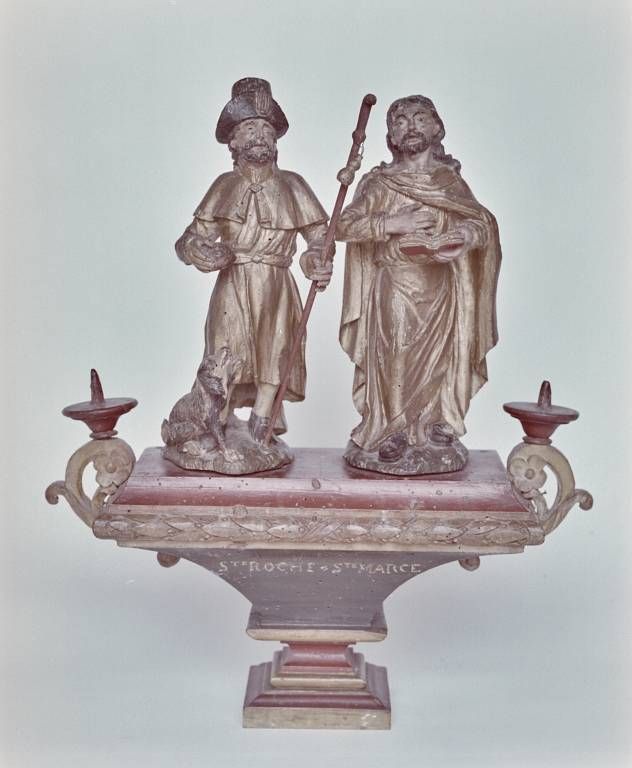 saint Roch : pèlerin, chien, bâton, chapeau, pain ; saint Marc : livre