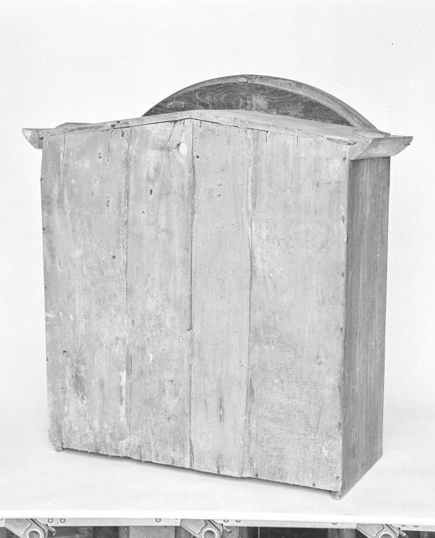 Bâton en bois peint et doré à la poudre. Vitrine en chêne à couronnement cintré, panneau postérieur en bois blanc ; assemblages chevillés à tenon et mortaise, panneau postérieur et dessus cloués.