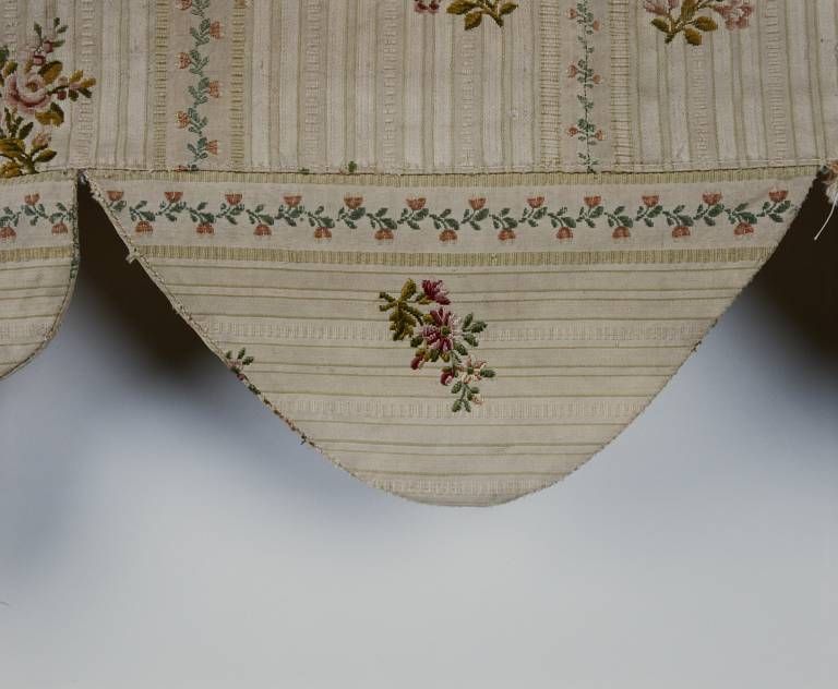 Pékin façonné rayé et broché, à effet de chaîne poil traînant, dit mexicaine. ; fond crème, rayures vert pâle, décor broché polychrome. Tapis constitué de trois lés entiers et deux incomplets, bordé de morceaux rapportés formant feston. Doublure blanche.