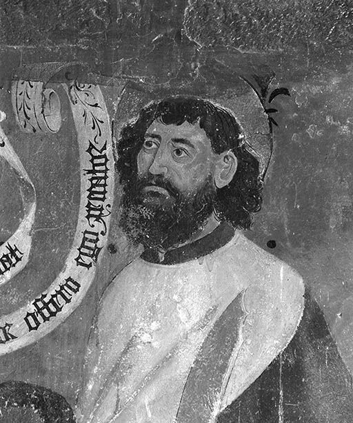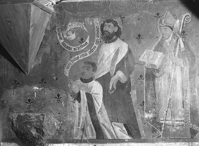Peinture murale de la fin du 15e siècle ; le prêtre donateur pourrait être le curé Pierre Laureau, mentionné dans le texte relatant la consécration de l'église en 1485 (extrait des registres de la paroisse) ou l'un de ses successeurs. Masquée un temps par les boiseries du choeur, l'oeuvre a été restaurée et largement repeinte en 1895.