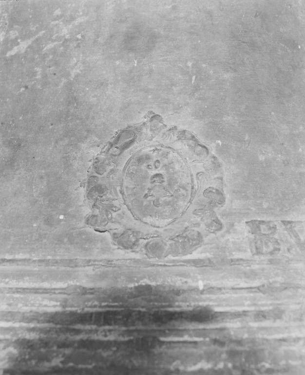 Relief d'applique représentant le Christ en croix sur la faussure, feuilles d'acanthes au-dessus de l'inscription, motifs végétaux stylisés au-dessous.