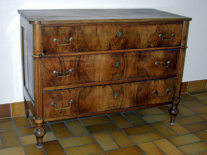 Façade à trois tiroirs superposés, pieds antérieurs tournés, montants antérieurs arrondis. Poignées et entrées de serrure en bronze.