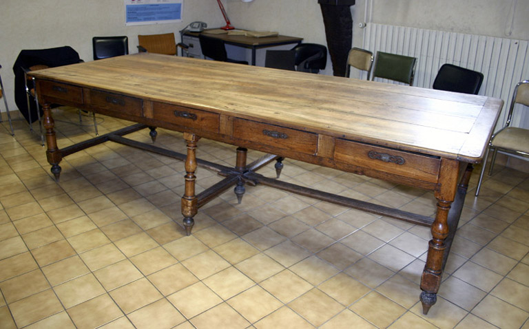 Grande table en noyer à six pieds tournés reliés par deux traverses d'entrejambes en H ; plateau à deux emboîtures ; ceinture et façade des tiroirs en chêne ; tiroirs de ceinture à poignées en fer découpé.
