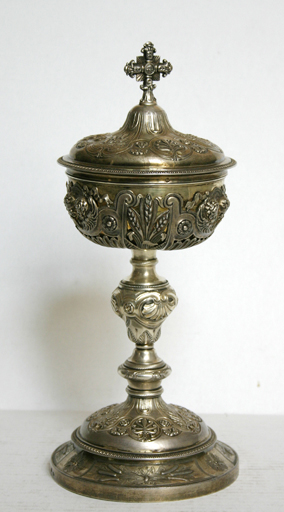 Ciboire en argent à décor repoussé et ciselé sur l'ensemble.