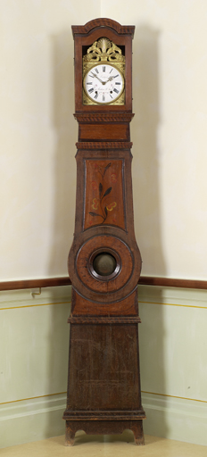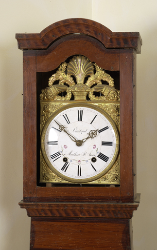 Décor floral peint sur le battant de la gaine, et sur le cadran. Décor en laiton encadrant le cadran horaire : cornes d'abondances et feuillage de part et d'autre d'un motif en éventail, fleurs et fruits dans une corbeille et dans des vases.