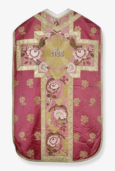 Fond en satin rouge, broché de filé or ; orfrois de la chasuble en satin rose, broché de soie polychrome et de filé or et argent. Galons tissés en filé or. Doublure en fine toile rose.