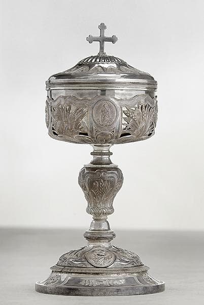 Fausse-coupe repercée, frise à la molette sur le pied, médaillons rapportés sur le pied et la fausse-coupe.