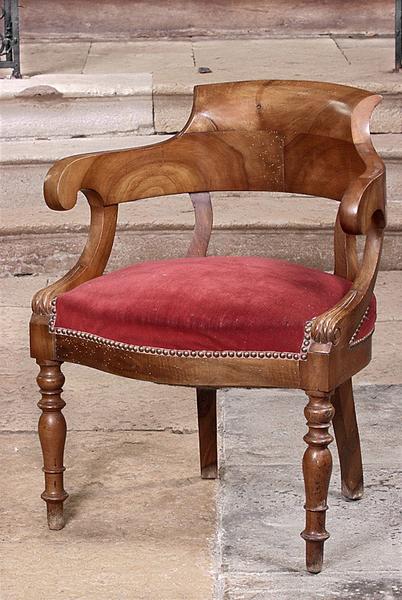Fauteuil en noyer verni, placage sur la ceinture. Pieds antérieurs tournés, ceinture galbée, supports d'accotoirs cintrés, dossier concave enroulé, en continuité avec les accotoirs. Garniture textile en velours coupé rouge.