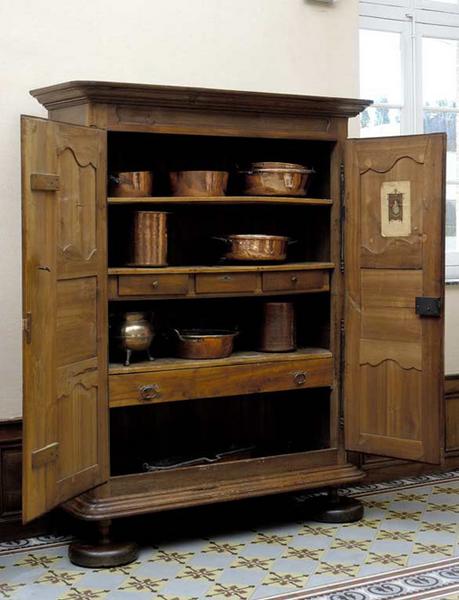Armoire démontable dont la caisse est constituée de deux éléments superposés. Façade à deux battants et faux dormant à gauche (avec fausse entrée de serrure) ; battants ornés de trois panneaux moulurés dont un à quadrilobes ; pieds antérieurs en miche. Aménagement intérieur : 1 rang de trois tiroirs et un tiroir de largeur.