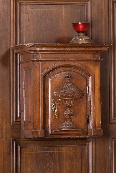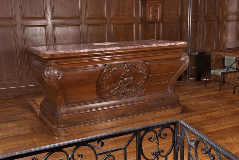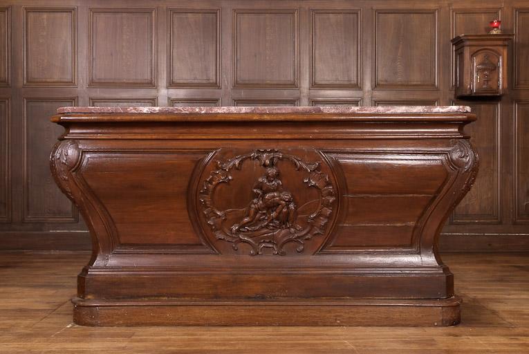 Autel d'élévation galbée et tabernacle d'élévation droite en chêne (?) ; table d'autel en marbre. Tabernacle fixé à la boiserie derrière l'autel.
