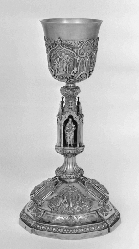 Poinçon de fabricant : Marie Thierry, sur la coupe, le pied et la patène ; petite garantie sur le noeud ; Minerve sur la coupe, la fausse-coupe, le pied et la patène ; inscription sous le pied, gravée : ABBE V. SURIEUX AUMONIER DU BORDA.