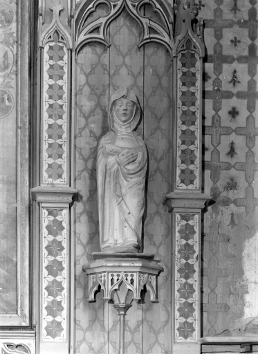 h = 90 ; la = 30 ; pr = 18. Dimensions de la statue de la Vierge. Dimensions de la statue de saint Jean : h = 92 ; la = 32 ; pr = 18.