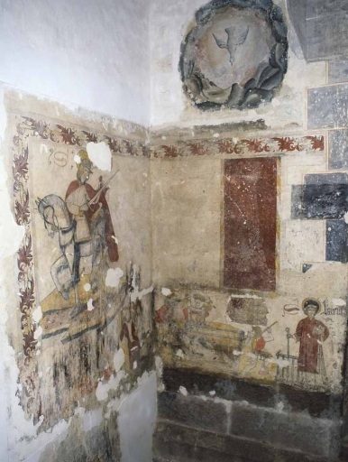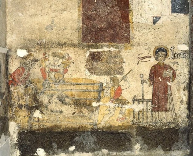 Les représentations de saint Laurent sont contemporaines de la peinture de saint Martin, figurée au-dessus. Toutefois, la scène du martyre de saint Laurent aurait pu être antérieure aux deux grandes figures des saints, ce qui expliquerait l'impression que le sol sur lequel se tient Laurent, est repris dans la scène du supplice. Cependant, l'emploi constant du rouge foncé infirmerait cette remarque. En revanche, la frise de feuillages rouges enlacés sur une tige de bois semble avoir été ajoutée postérieurement puisqu'elle fait disparaître la pointe de terre qui supporte saint Martin. Aisément lisible, les têtes sont clairement individualisées : au visage lisse et jeune de Martin, et à sa chevelure blonde, s'oppose le visage disgracieux du mendiant au nez trop proéminent, à l'oeil exorbité, à la longue barbe brune, de même couleur que ses cheveux, de même pour saint Laurent et ses bourreaux. Le dessin est précis et sûr, notamment pour la tête du cheval qui est très réussie. Les tons sont un peu plus variés, avec du jaune et du gris, mais ne sont pas d'une grande richesse. Les détails vestimentaires : chapeau, éperons et auréole de saint Martin engagent à dater cette oeuvre de l'extrême fin du 15e siècle, voire du tout début du 16e siècle. Le peintre devait connaître les techniques des enluminures et des tableaux sur chevalet. Il se dégage dans la représentation de saint Martin une grande maîtrise. Cet ensemble peint devait s'accorder avec un autel.