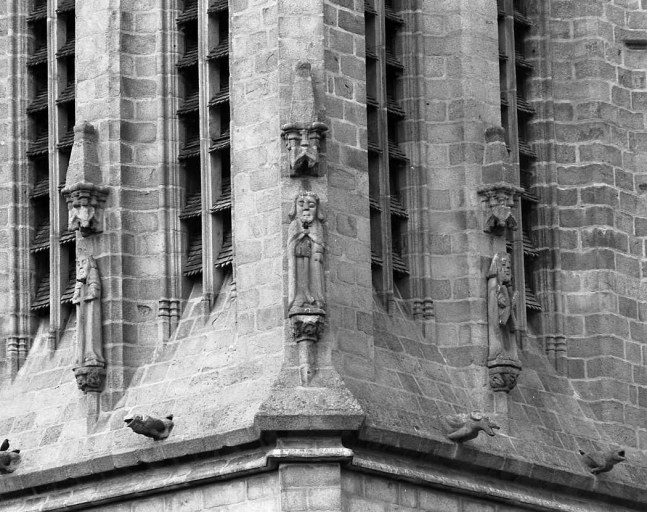 appliqués aux murs du clocher au niveau de sa partie supérieure, placées sous des culots et surmontées d'un dais.