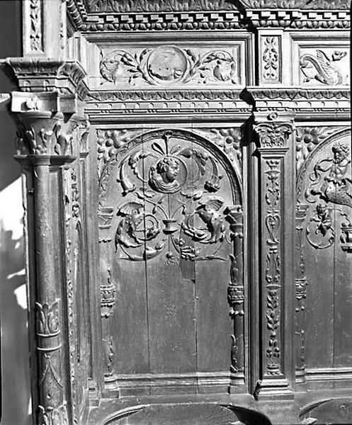 figures mythologiques (couple : satyre, cuir)£scène (homme : assis, pot, homme : agenouillé, penché, pot)£figure (saint : ?, draperie, foulant aux pieds : serpent, bannière)£représentation animalière (lion)£scène (femme, couché sur le côté, femme : agenouillé, main : joint)£scène (femme, bagarre, cheveux)£scène (moquerie, scène : équitation, femme, bâton, à califourchon, Aristote : ?, à quatre pattes)£scène (ange, couché sur le côté, en appui, crâne, personnage, robe, livre)£ornementation (grotesque)£figure biblique (saint Jean, calice) ; ornementation£figure biblique (saint Jean-Baptiste, agneau, livre) ; ornementation£figure biblique (Christ bénissant) ; ornementation£scène (ange, nu, portant : armoiries : ?)£scène (femme, couché sur le dos, bâton, personnage, couché sur le ventre)£scène (femme : agenouillé, lessive)£scène biblique (Dalila, ciseaux, cheveux : Samson)£scène (?)£ornementation (grotesque)£figure (moine, livre) ; ornementation