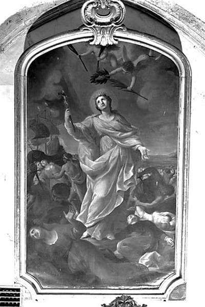 tableau et son cadre : le Martyre de sainte Ursule et de ses compagnes
