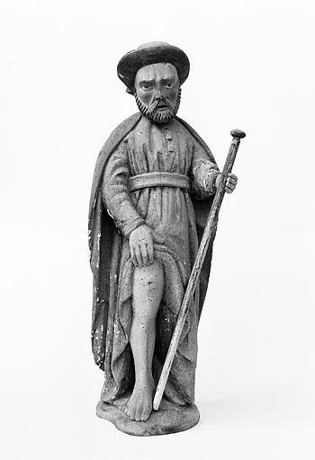 Statue en plusieurs éléments : bras, main gauche et canne rapportés. Polychromie : habit vert, manteau bleu, chapeau noir.