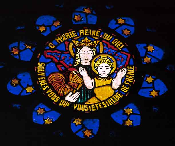symbole (symboles des Litanies : Fontaine, temple : Salomon, lys, trône : sagesse, miroir : justice) ; figures bibliques (Vierge à l'Enfant, attribut : coq, représentation d'objet : carte : France, étoile) ; symbole (Vierge : symbole, tour : ivoire, vase, rose, porte)