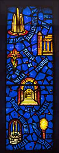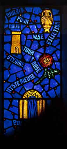 PRIEZ POUR NOUS FONTAINE JAILLISSANTE, TEMPLE DE SALOMON, LYS DE LA VALLEE, TRONE DE LA SAGESSE, FONTAINE SCELLEE, MIROIR DE JUSTICE, baie 11. PRIEZ POUR NOUS VASE D'ELECTION, TOUR D'IVOIRE, ROSE MYSTERIEUSE, PORTE DU CIEL, ETOILE DU MATIN, baie 12
