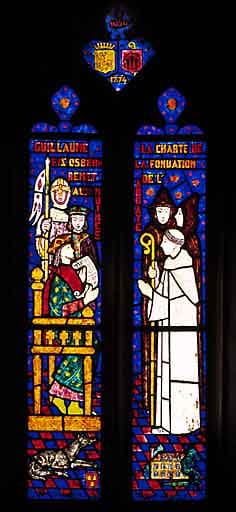 verrière figurée : Guillaume Fitz Osbern remet aux moines la charte de fondation de l'abbaye (baie 10)