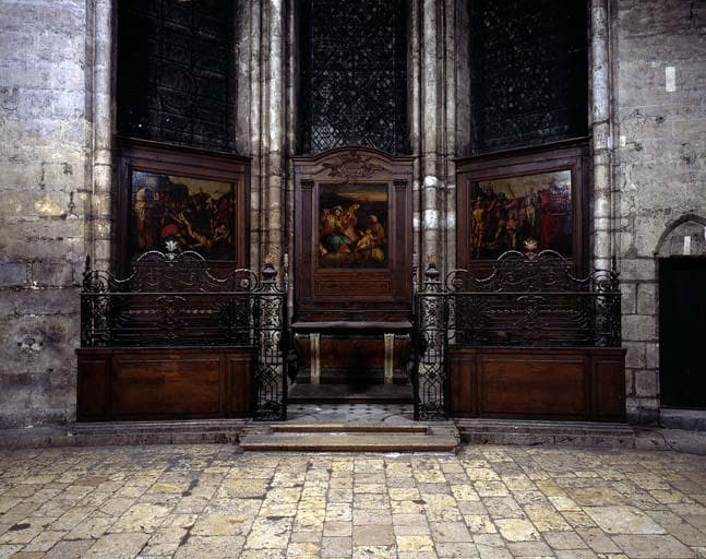 Ensemble fonctionnel composite ; la clôture de chapelle est datée du 18e siècle, les tableaux de la 1ere moitié du 17e siècle proviennent de l'église Saint Pierre de Chartres.