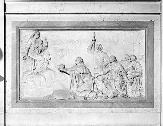 8 bas-reliefs : Adoration des bergers, Adoration des Mages, Présentation au Temple, Déploration, Voeu de Louis XIII, Condamnation de Nestorius au concile d'Ephèse, Immaculée Conception, Signe donné à Achaz