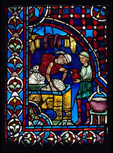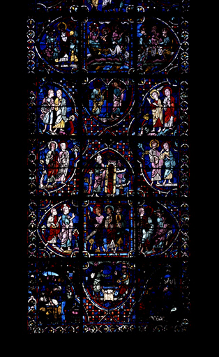Verrière contemporaine de la cathédrale actuelle reconstruite après l'incendie de 1194. Selon la chronologie traditionnelle, elle peut être datée entre 1210 et 1225 et fut offerte par la gilde des boulangers.
