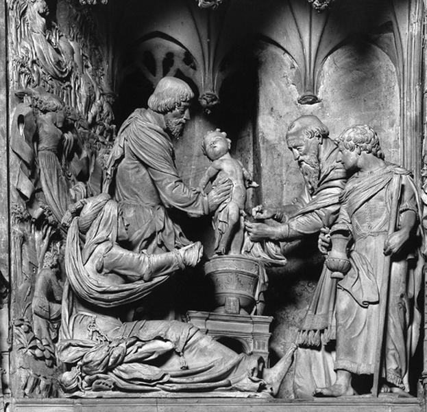 Source littéraire : Bible, Evangile de Luc 2, 21. La scène se passe au Temple en présence de Marie, ce qui constitue un contresens religieux car la mère ne pouvait pénétrer dans le lieu saint qu'après sa propre purification, quarante jours après la naissance. Celle-ci, au premier plan, est assise au sol. Le vieux prêtre, assisté d'un jeune homme, est en train de pratiquer l'opération sur Jésus, debout sur le bassin et maintenu par Joseph. La Glorification des anges est représentée sur le pilier à gauche.