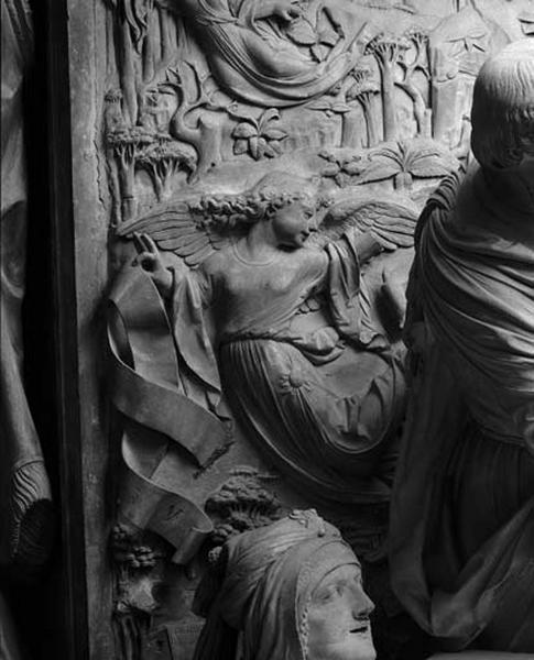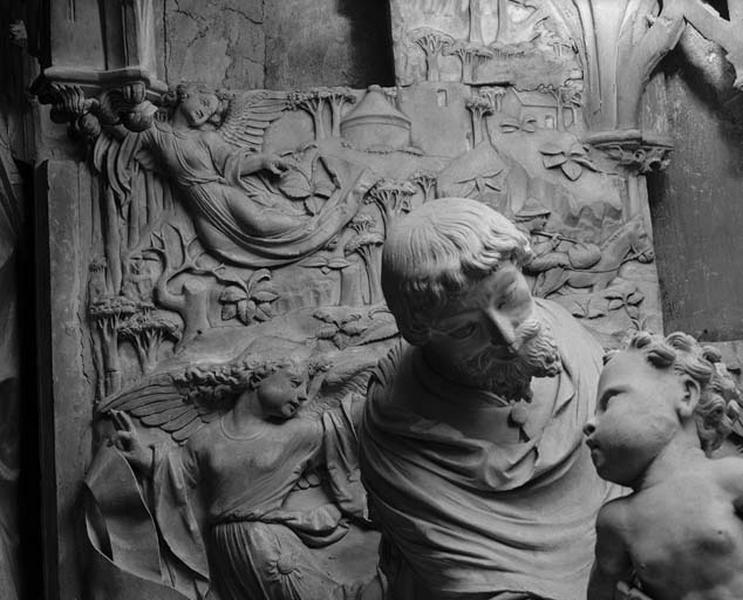Calcaire de Tonnerre (Yonne). Scène à 5 personnages. Un relief pictural est sculpté sur le pilier, au fond de la niche à gauche.