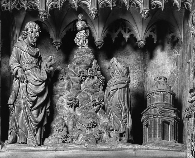 Trois groupes sont commandés à Thomas Boudin dans un marché passé le 20 août 1611 : les Tentations du Christ au désert, la Cananéenne et la Transfiguration qui doivent être posés avant le jour de Pâques 1612. Le contrat prévoyait de suspendre un dragon à la voûte, qui a disparu ou ne fut pas réalisé.