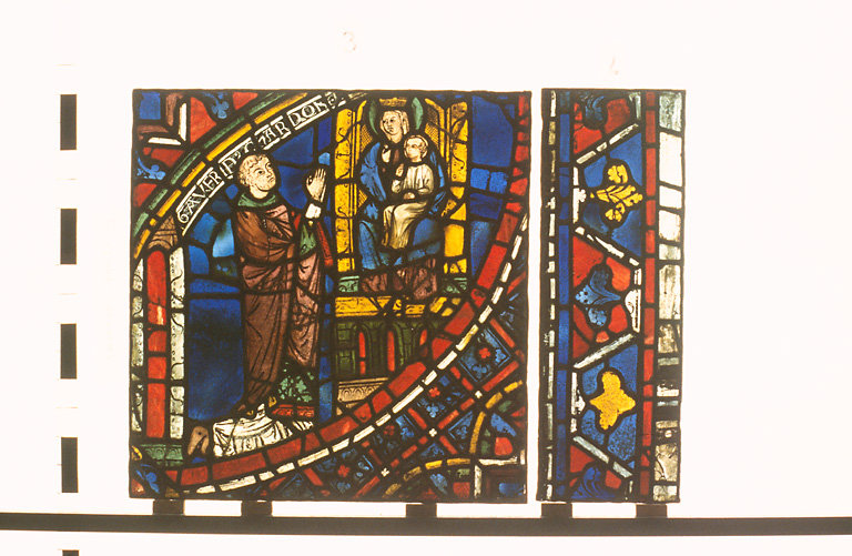 Lancette gauche : le chanoine Geoffroy Chardonel, donateur, est représenté en prière devant la Vierge au registre inférieur droit, bordure de palmettes et bâtons brisés. Lancette droite : le chanoine Etienne Chardonel, donateur, est représenté agenouillé devant la Vierge, et sa famille, au registre inférieur, bordure de feuillages enroulés sur une tige. Oculus : Christ bénissant et Tétramorphe.