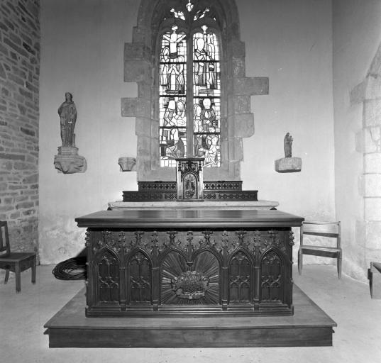 L'autel avec gradins et tabernacle (dissociés) de style néogothique est une oeuvre de la seconde moitié 19e siècle. Les cinq verrières (scènes de la vie du Christ, saint Roch, labours, cuisson du pain) ont été exécutées en 1983 par le peintre-verrier Jean-Pierre Le Bihan de Quimper.