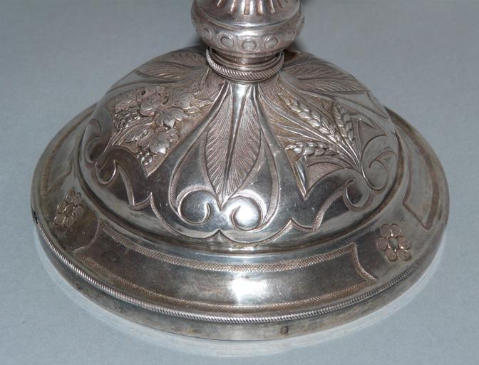 Ciboire réalisé au milieu du 19e siècle par l'atelier d'orfèvres lyonnais Favier frères, comme l'indiquent les poinçons insculpés sur l'oeuvre.