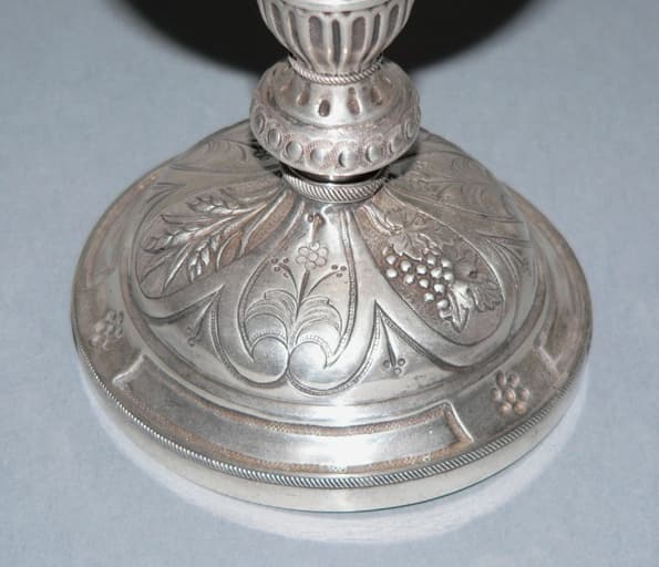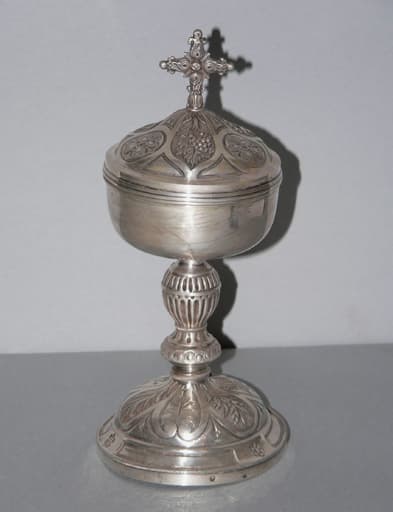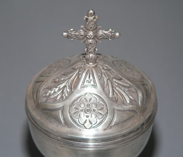 Ciboire en argent repoussé et ciselé. Couvercle emboîtant sommé d'une croix en argent fondu.