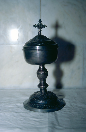 Ciboire réalisé au milieu du 19e siècle par l'atelier d'orfèvre lyonnais Favier frères, comme l'indiquent les poinçons insculpés sur l'oeuvre.