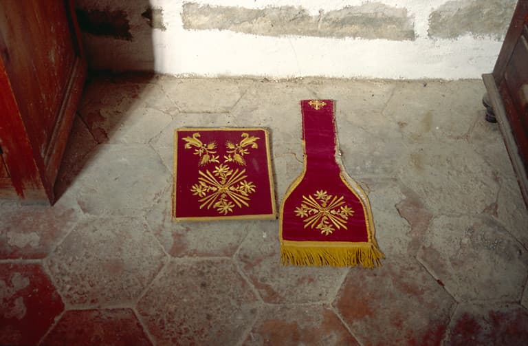 bourse de corporal, chasuble, manipule (ornement rouge)