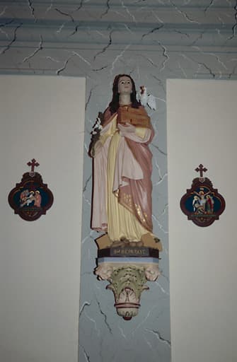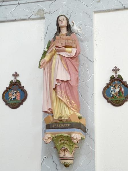 Sainte Réparate, en pied, de face, colombe, lys, église