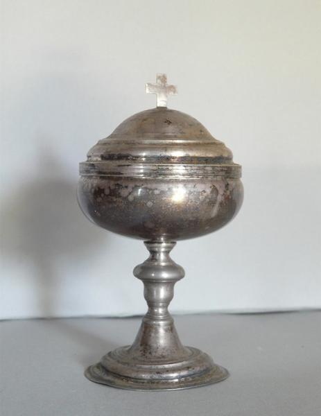 Ciboire en argent repoussé et au décor ciselé. Noeud balustre. Couvercle emboîtant sommé d'une croix en argent découpé.