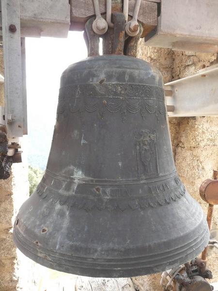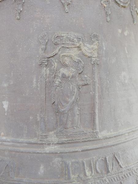 Cloche No 1 : partie supérieure de la paroi ornée de deux frises, l'une à décor de rinceaux feuillagés et la seconde à décor de draperie ; Immaculée Conception et sainte Lucie, en pied, de face, sous un dais, figurées au centre de la robe au-dessus de deux filets ; partie inférieure de la panse occupée par l'inscription qui court sur une ligne et au-dessous de laquelle se déploie une frise de guirlandes feuillagées ; trois filets ornent la panse. Cloche No 2 : partie supérieure de la panse ornée de deux frises, l'une à décor de grecques et la seconde à décor de festons ; Christ en croix, Sacré-Coeur et sainte Dévote, en pied, de face, figurés au centre de la robe au-dessus de deux filets ; partie inférieure de la paroi occupée par l'inscription qui court sur une ligne et au-dessous de laquelle se déploie une frise de draperie ; trois filets ornent la panse.