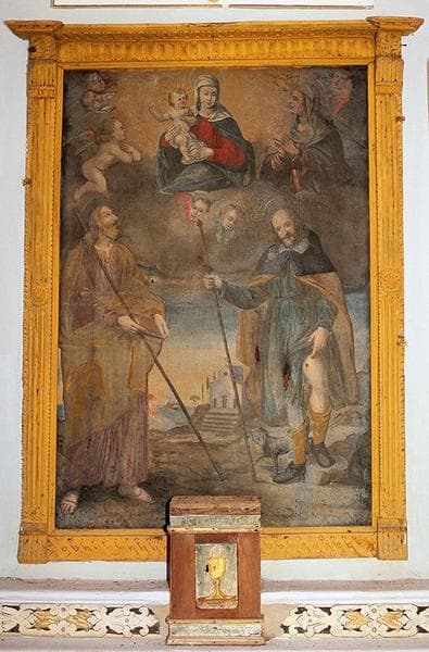 tableau d'autel et son cadre : Apparition de la Vierge à l'Enfant à saint Jacques et saint Roch