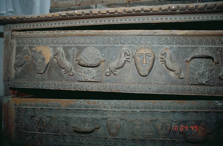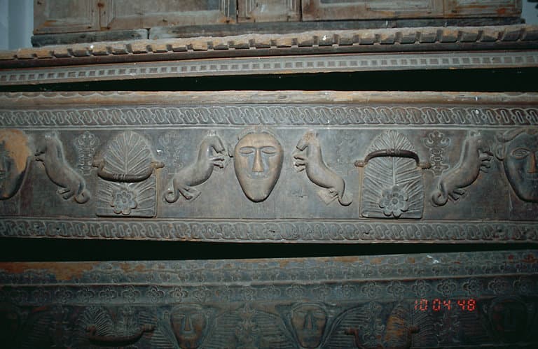 bois (châtaignier) : taillé, mouluré, peint, décor dans la masse, décor en relief, décor rapporté