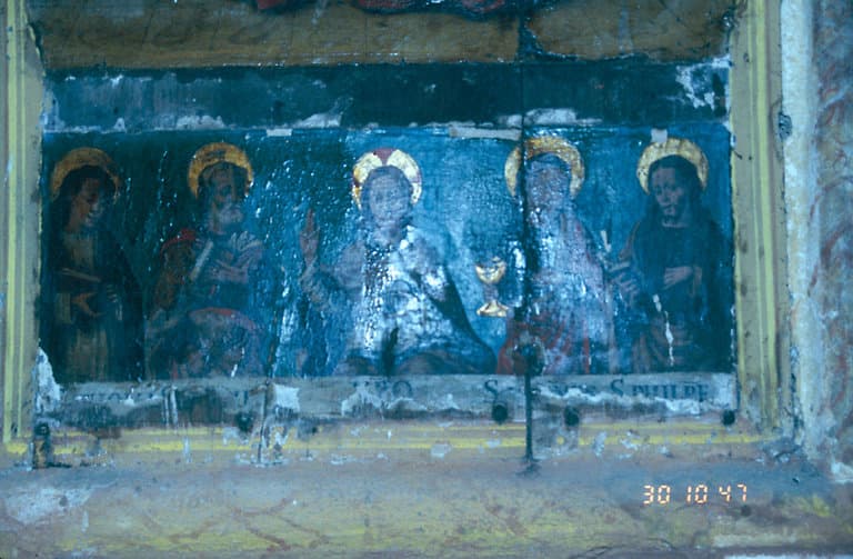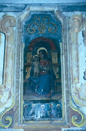 Vierge à l'Enfant assise sur un trône, occupant le centre du retable. Christ bénissant entouré de saint Pierre, saint Jean, saint Philippe et saint Jacques, figurés sur la prédelle.