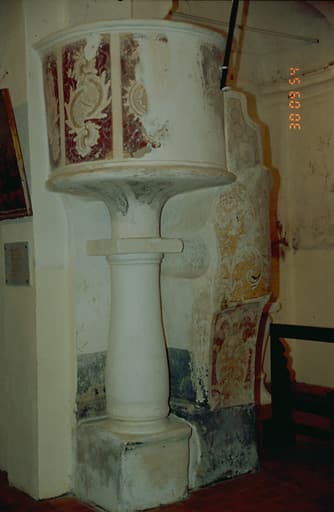 Cuve sur pied, de plan semi-circulaire ; escalier à rampe pleine galbée.