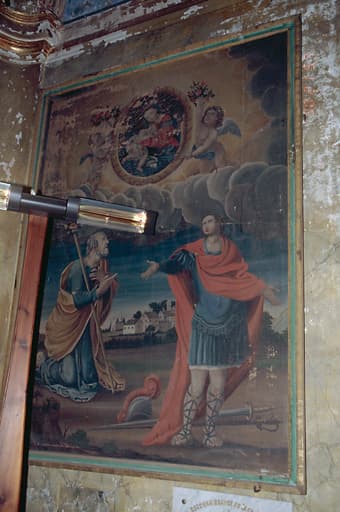 Vierge à l'Enfant, saint Joseph, saint Pancrace, fond de paysage, église.