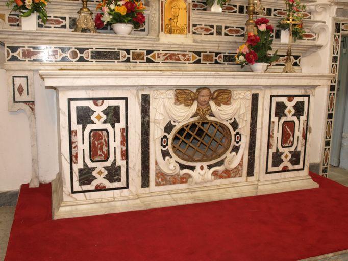 L'autel tombeau, de plan rectangulaire et d'élévation droite, est surmonté de trois gradins. L'élévation antérieure est percée en son centre d'une niche fermée par une grille en fer forgé. Le tabernacle à pans coupés repose sur le premier gradin. Sa face antérieure est flanquée de deux colonnes ioniques supportant un entablement surmonté d'une corniche moulurée. Il est couvert d'un dôme polygonal. L'autel et le tabernacle sont en marbre blanc, incrusté de marbres de différentes couleurs (rouge du Languedoc, brocatelle, vert de mer, portor noir, jaune de Sienne). Retable architecturé à niche cantonné de deux colonnes torses à chapiteaux composites. Ailes du retable comportant chacune une armoire à reliques, fermée par un panneau de bois peint, aux contours chantournés, flanquées de deux pilastres. Entablement mouluré à ressauts avec boules en amortissement et fronton interrompu à volutes. Le retable est constitué d'un noyau de maçonnerie, recouvert de stuc mouluré et peint.