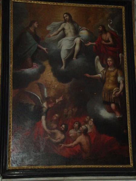 tableau d'autel : Intercession de la Vierge et de saint Jean-Baptiste en faveur des Ames du purgatoire en présence de saint Michel
