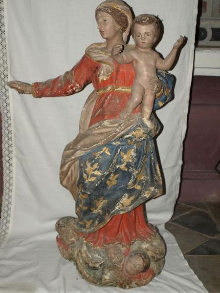 La Vierge en pied tient l'Enfant Jésus avec sa main gauche. Deux têtes d'anges sont sculptées au niveau du socle en forme de nuée.