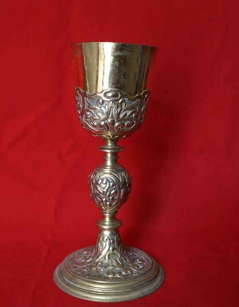 Le pied de ce calice est de plan circulaire, le nud de la tige est ovoïde. Le pied et la fausse coupe sont en cuivre doré. La coupe est en argent doré. Le décor est repoussé et ciselé.